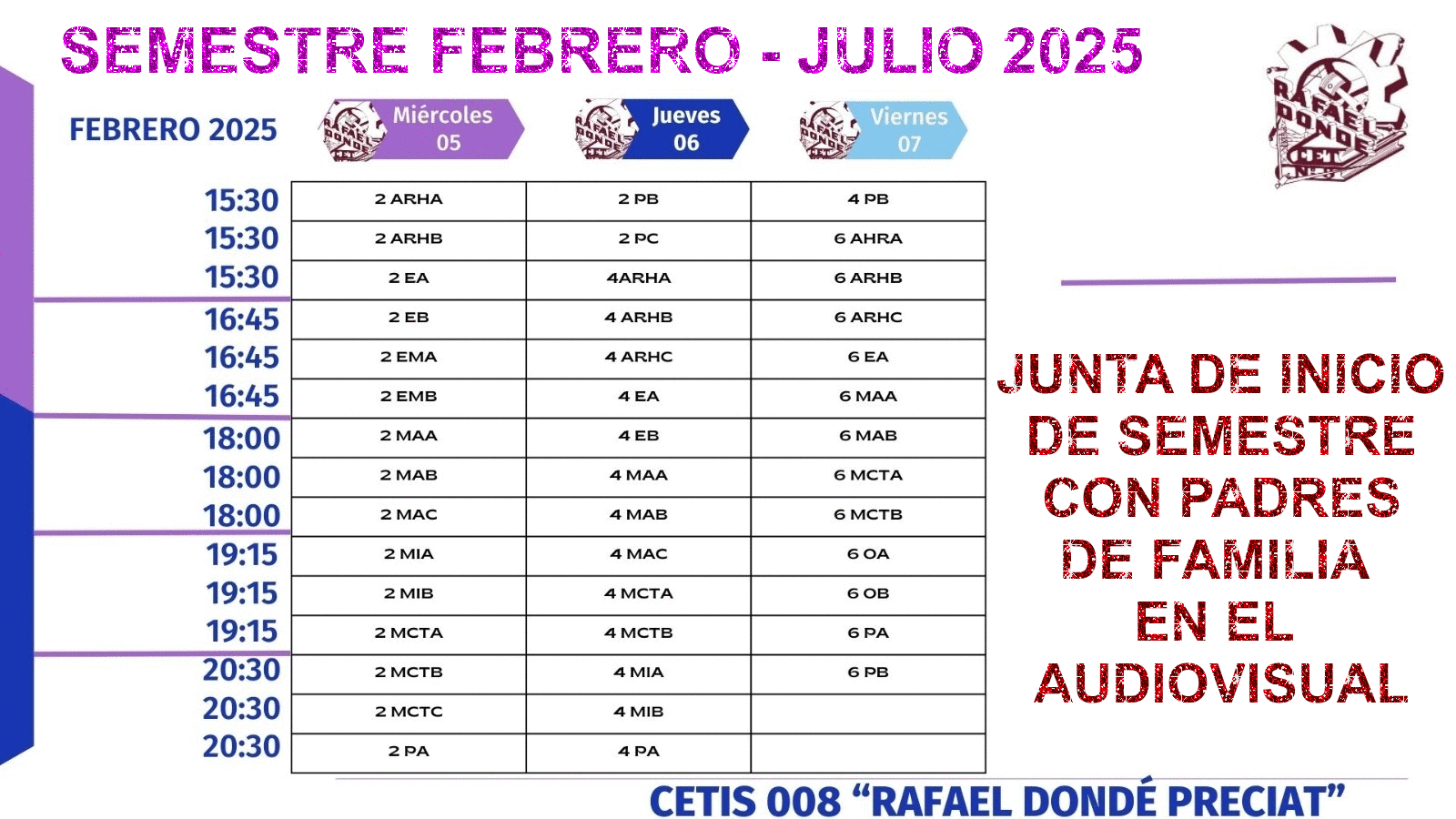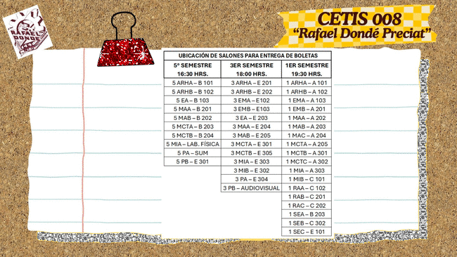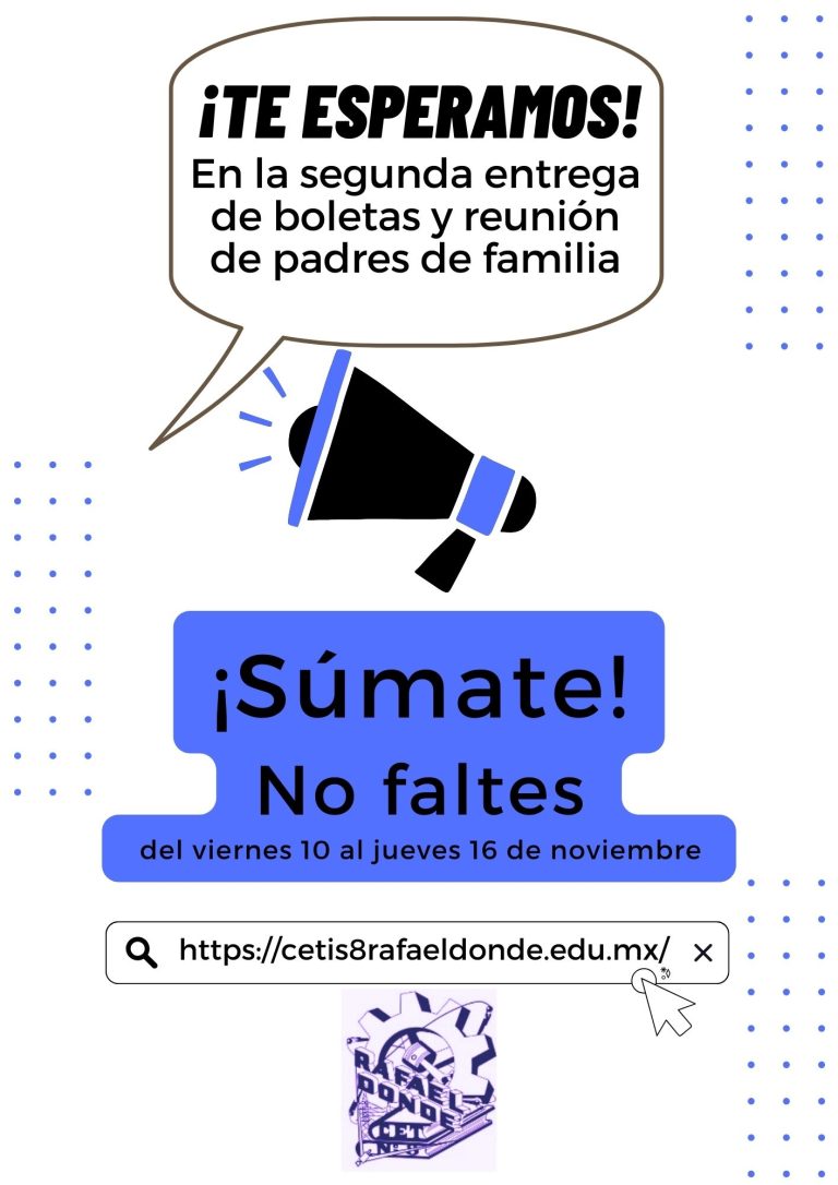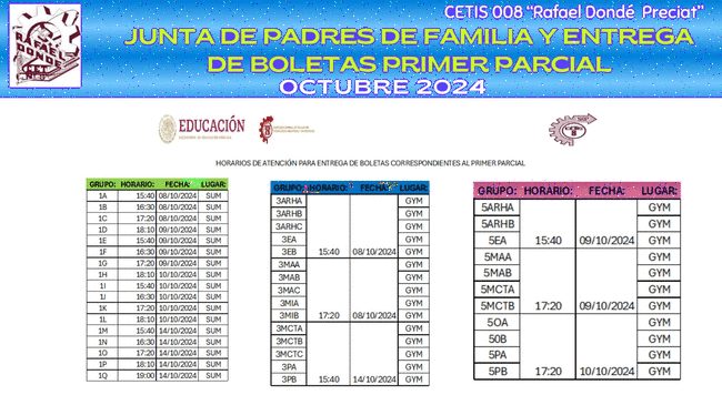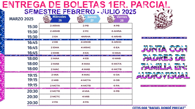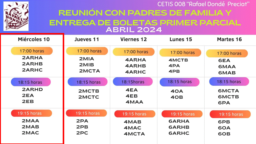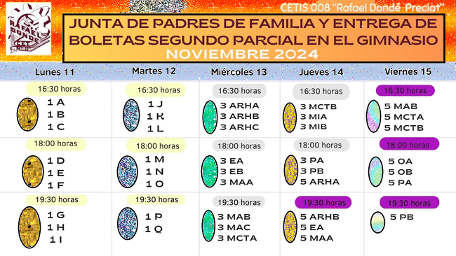 Buen día Estimados Padres de Familia y Tutores. Reciban un cordial saludo y utilizamos este medio para informarles que desde el próximo Viernes 10 y hasta el jueves 16 de Noviembre-2023 de acuerdo al aviso enviado al correo institucional de sus hijos y al citatorio enviado a ustedes, será la entrega de boletas en el Audiovisual del plantel (en el horario que se muestra en la siguiente imagen), por lo cual requerimos su presencia y participación. Contamos con su asistencia, gracias.