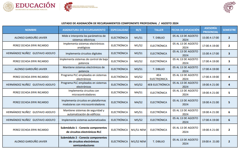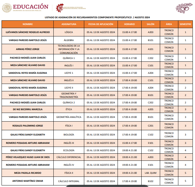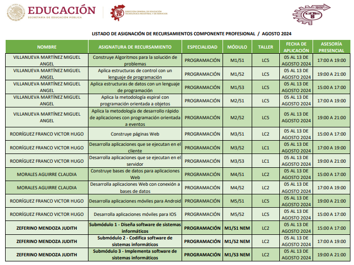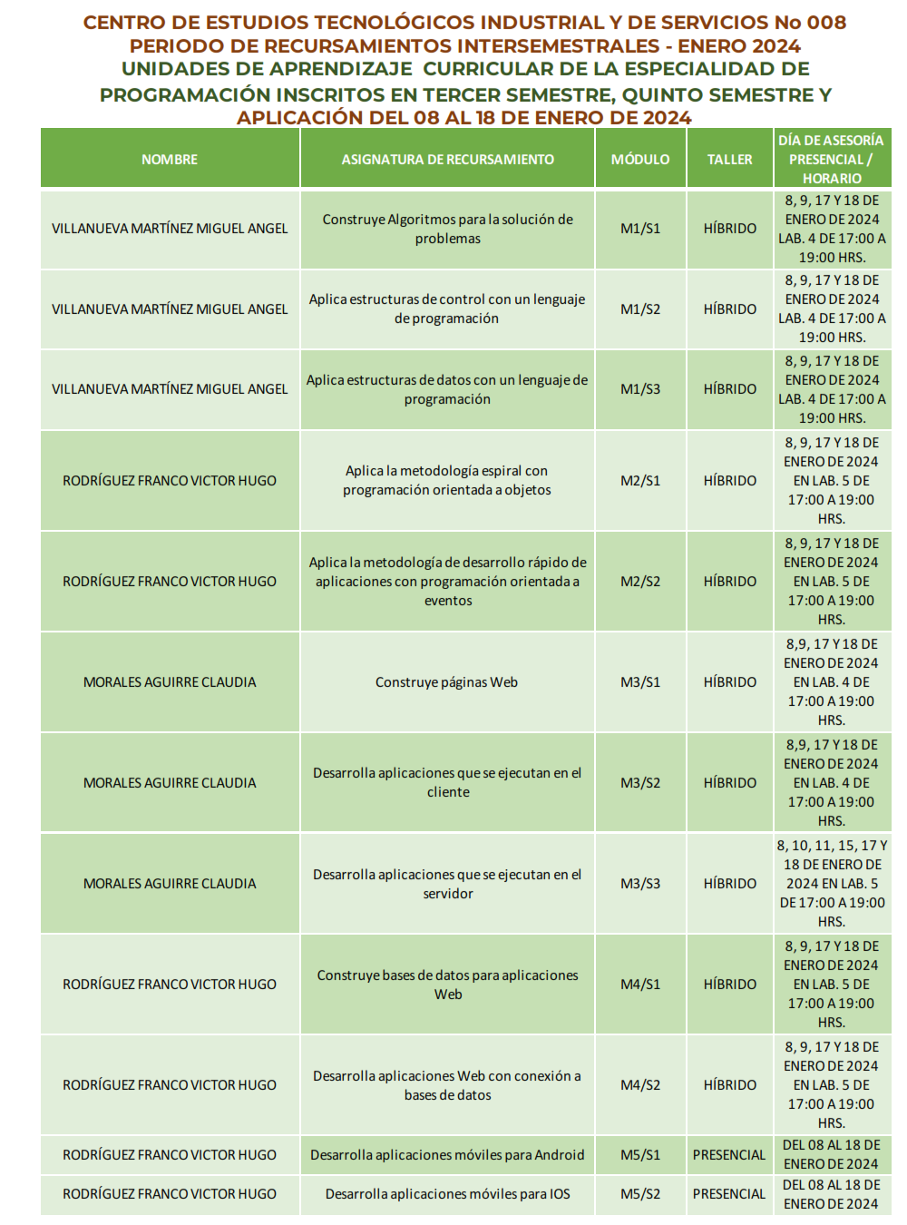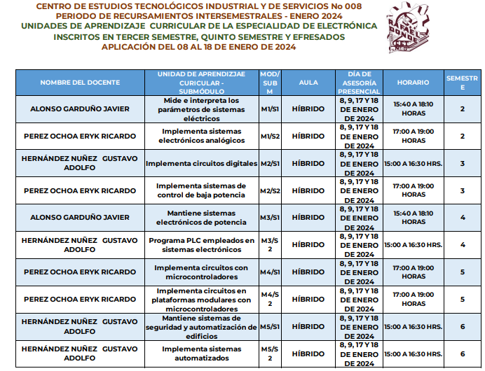 Horarios de Recursamiento Enero 2024 por Especialidad