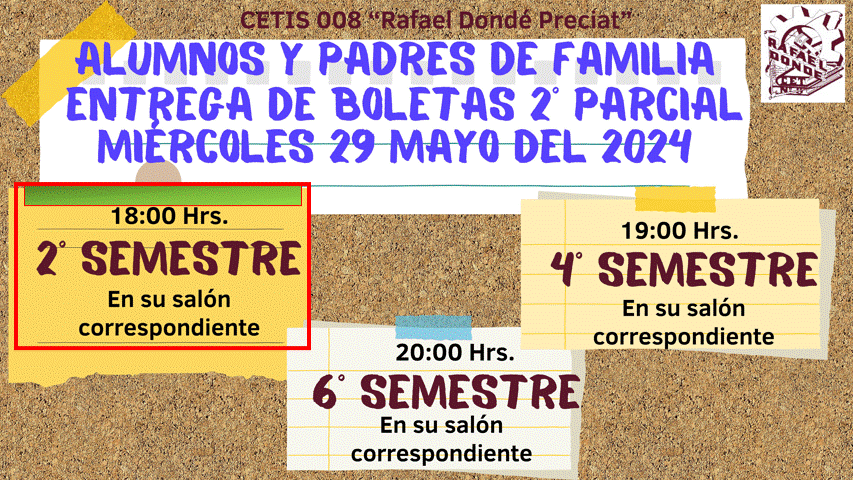 Buen día Estimados Padres de Familia y Tutores. Reciban un cordial saludo y utilizamos este medio para informarles que el día Miércoles 29 de Mayo de acuerdo al aviso enviado al correo institucional de sus hijos, será la entrega de BOLETAS correspondiente al segundo parcial, por lo cual requerimos su presencia y participación. Contamos con su puntual asistencia, gracias.