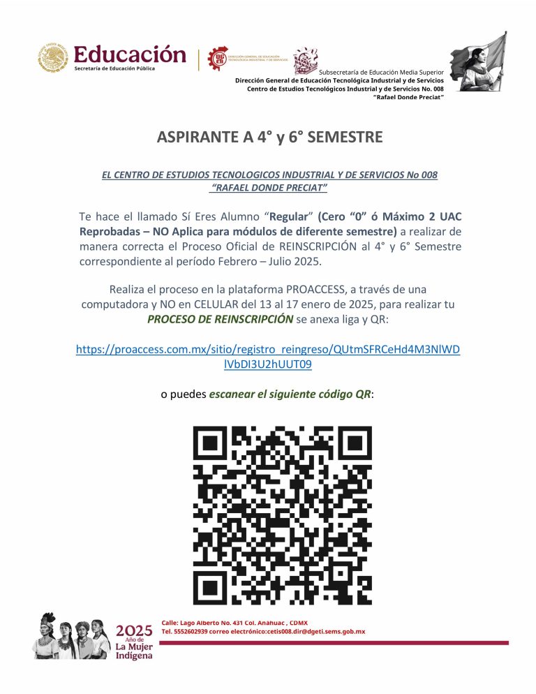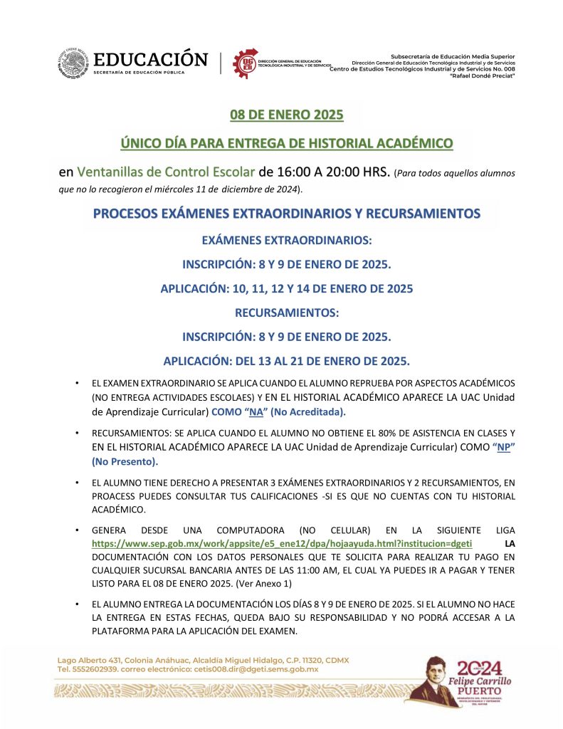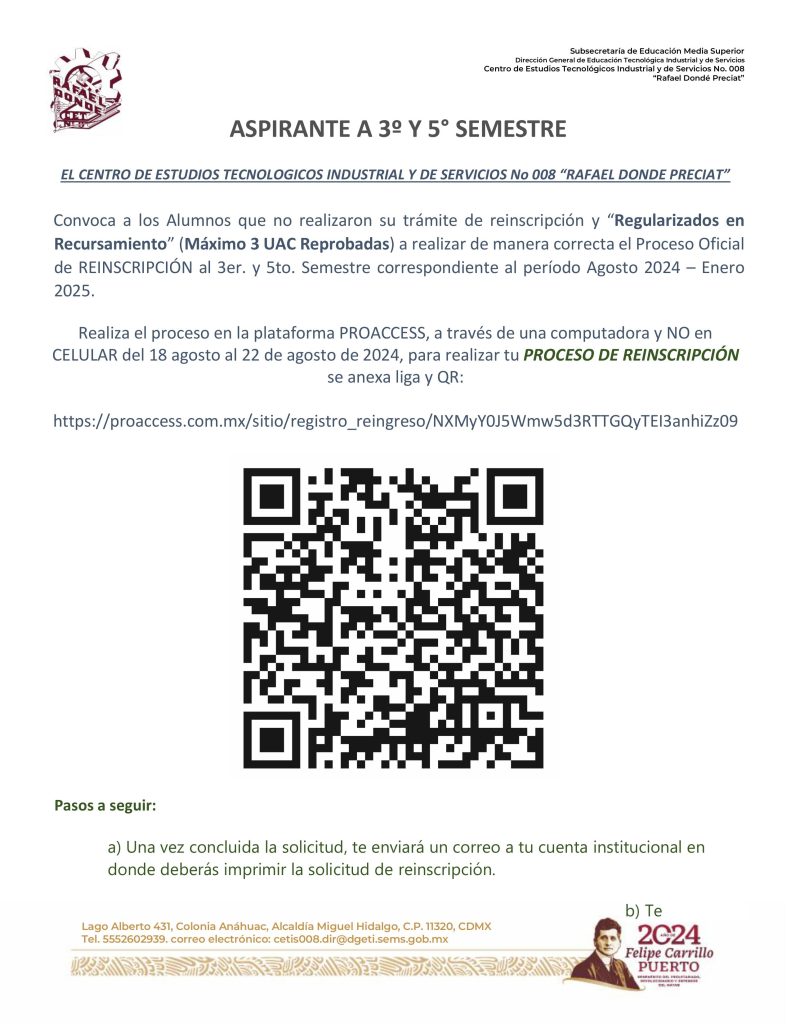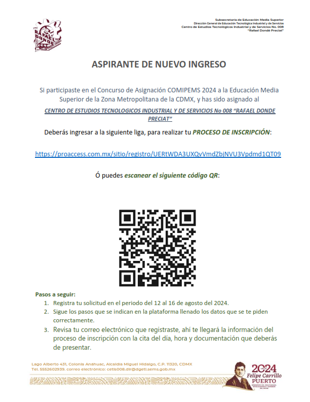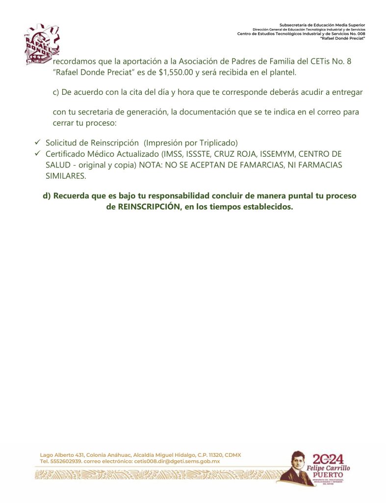 Te invito a que leas todo el comunicado antes de iniciar el proceso, no se contestaran correos, toda duda deberás acudir al plantel el 7 de agosto, en un horario de 14:50 a 20:30 horas.