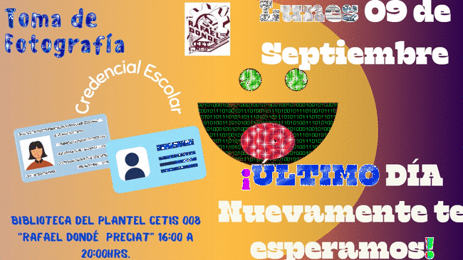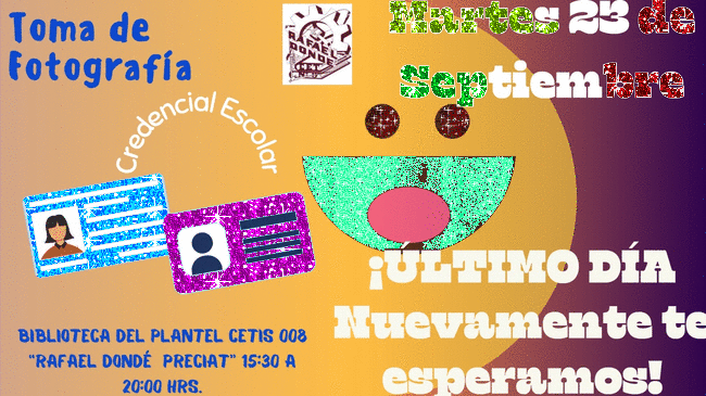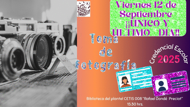 Para la toma de foto para tú credencial a partir de las 16:00 hrs en la Biblioteca de nuestra institución CETIS 008 "Rafael Dondé Preciat".