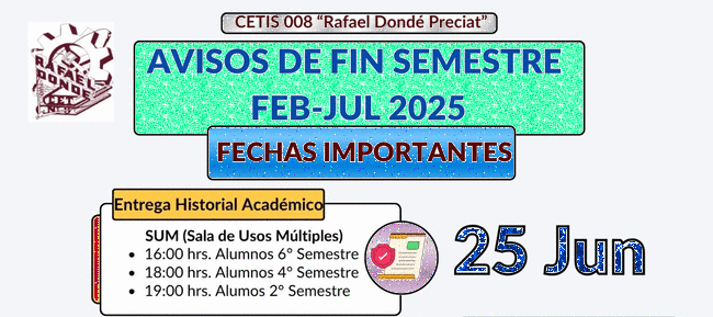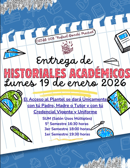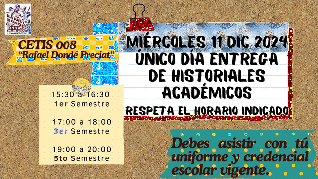 Buen día Estimados Padres de Familia y Tutores. Reciban un cordial saludo y utilizamos este medio para informarles que el día Viernes 8 de Diciembre de acuerdo al aviso enviado al correo institucional de sus hijos, será la entrega de HISTORIALES ACADEMICOS, por lo cual requerimos su presencia y participación. Contamos con su asistencia, gracias.