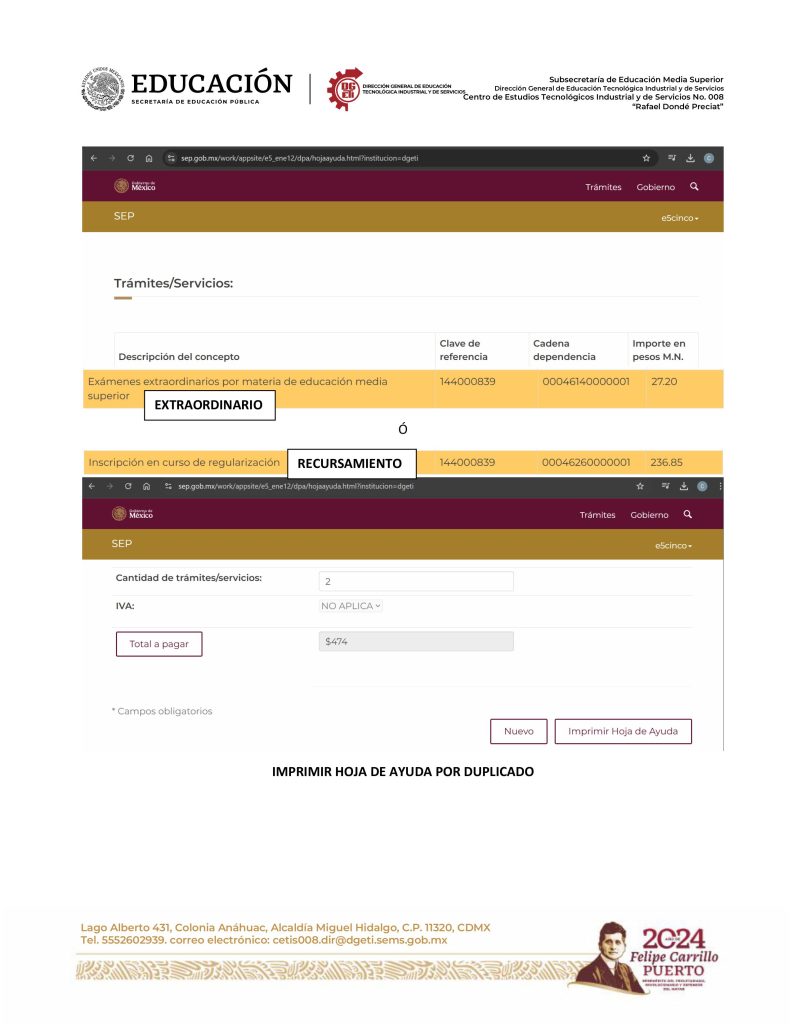 g) Una vez registrado tus recursamientos, entra a la LIGA que está en el cuadro de OBSERVACIONES de la plataforma PROACCESS, requisita la hoja de pago de los intersemestrales, y acudir a pagar en cualquier sucursal bancaria. Ejemplo de llenado de la hoja de Hacienda: