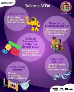 🔬🎉 ¡*Movimiento STEM+* te invita a vivir la ciencia de una forma divertida! 🎉🔬 Nos emociona ser parte del evento *"Niñas y niños jugando con ciencia" en el Universum*, y queremos invitarte a participar en las actividades que el *Ecosistema STEM* ha preparado especialmente para ti. 🚀✨ 📍 *Presencial en Universum, CDMX* 📆 Del *30 de abril al 2 de mayo* habrá *talleres, experimentos, actividades interactivas y muchísima diversión*. Consulta los horarios y ¡no te pierdas esta gran experiencia! 🚀