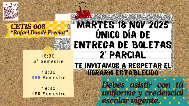 Reciban un cordial saludo y utilizamos este medio para informarles que el próximo miércoles 11 y 12 de octubre de acuerdo al aviso enviado al correo institucional de sus hijos y al citatorio enviado a ustedes, será la entrega de boletas a las 19:00 horas, en el salón de sus hijos, dichas boletas serán entregadas por sus tutores Académicos, por lo cual requerimos su presencia y participación.